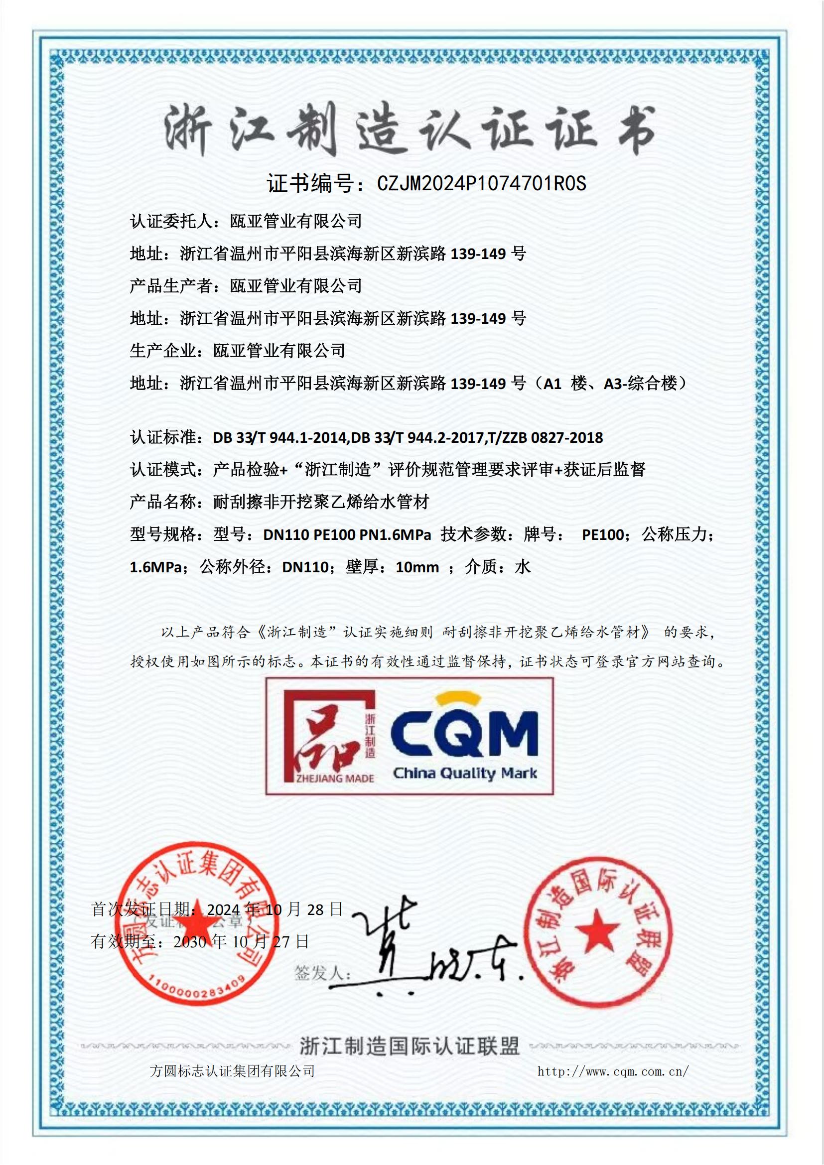 浙江制造認證證書