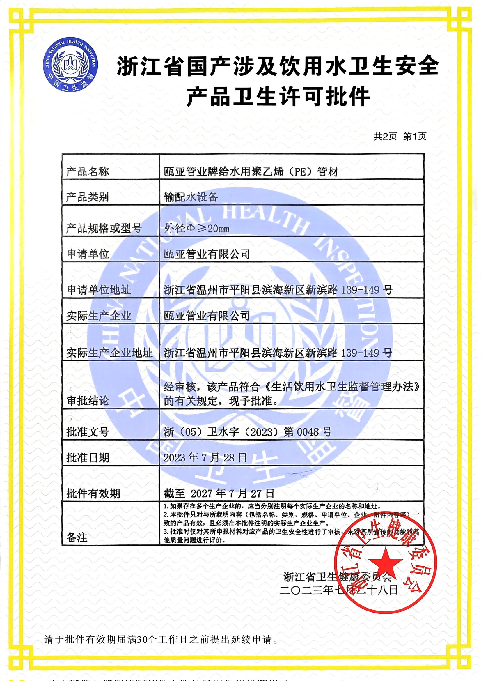 衛生許可批件